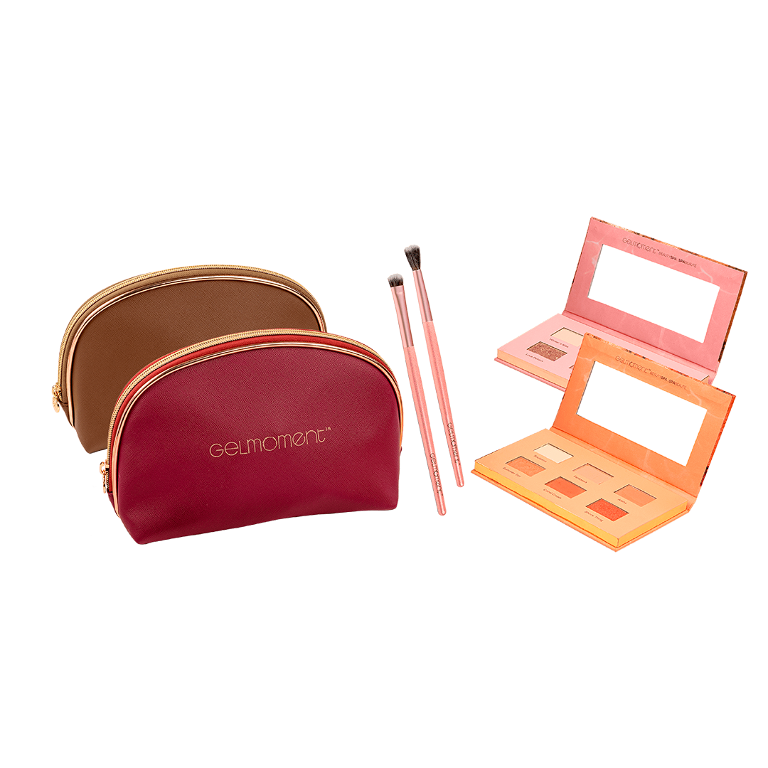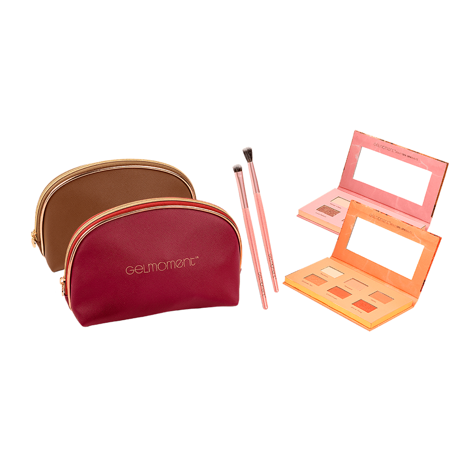 Bundle includes 1 TOUJOURS Eyeshadow Palette (choice of Pink or Peach), 1 Eyeshadow Brush Set and 1 Cosmetic Bag (choice of Burgundy or Brown). Available while cosmetic bag supplies last.