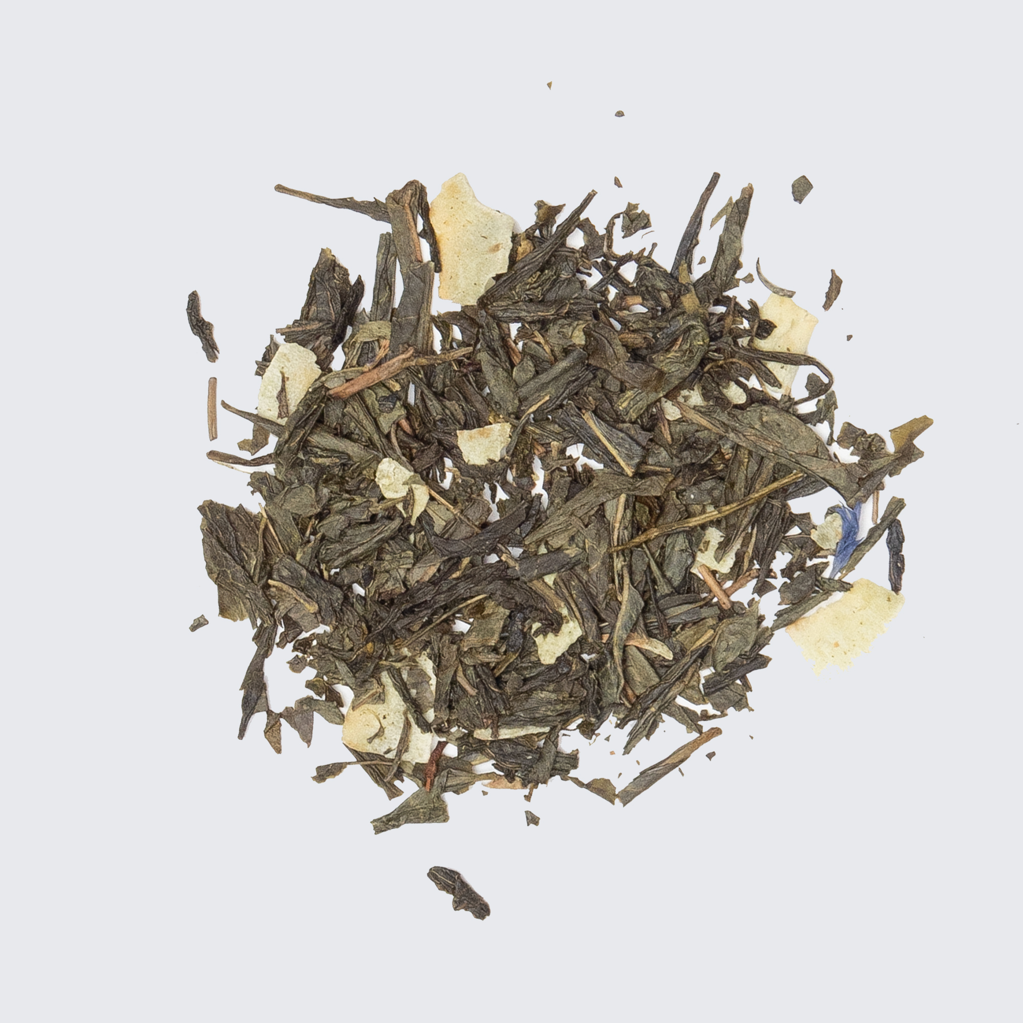 Sencha green tea, coconut chips, coconut extract, carrots, cornflower.